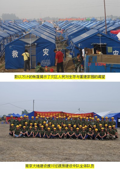 南京大地建設(shè)援川過渡房建設(shè)中隊,于5月24日奉命緊急赴川,日夜兼程,經(jīng)過32個小時的長途跋涉,行程1900公里,于5月27日凌晨2:00到達(dá)棉竹災(zāi)區(qū)。在市建工局建設(shè)大隊的統(tǒng)一領(lǐng)導(dǎo)下,立即投入到過渡房建設(shè)籌備工作中去。災(zāi)區(qū)施工現(xiàn)場條件異常艱苦,晴天塵土蔽日,雨天泥濘濕滑,供水、供電不正常。山區(qū)海拔近4000米,日照強(qiáng)烈,我們的隊員近70%都被烈日灼傷過皮膚。帳篷里白天溫度高達(dá)42度,夜晚僅有10多度。就是在這樣的條件下,全體隊員心系災(zāi)區(qū)人民,積極勤奮地全力以赴投入到工作中去。