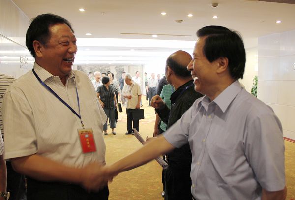 全國人大財政經(jīng)濟委員會副主任委員梁保華與于國家董事長握手交談