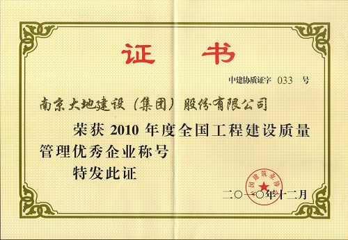 近日,經(jīng)中國建筑業(yè)協(xié)會(huì)、全國工程建設(shè)質(zhì)量管理優(yōu)秀企業(yè)評(píng)審委員會(huì)審定,南京大地建設(shè)(集團(tuán))股份有限公司榮獲“2010年度全國工程建設(shè)質(zhì)量管理優(yōu)秀企業(yè)”稱號(hào)。