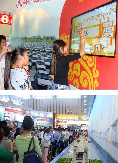 一個個展廳用圖片、視頻、模型、沙盤、實物等多種形式,生動鮮活地展示了新中國六十年來各個方面取得的舉世矚目的成就。描繪百姓衣食住行變化的“!弊中谓M圖,100位為新中國成立做出突出貢獻的英雄模范人物和100位新中國成立以來感動中國人物的照片墻,展現(xiàn)現(xiàn)代化國防實力的各式艦艇和戰(zhàn)車模型,五十六個民族特色風采展示……大家被這些精彩的展覽深深地吸引,紛紛駐足觀看!