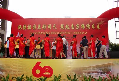 九月二十九日上午,市建設(shè)系統(tǒng)“祝福祖國美好明天,筑起南京錦繡未來”慶祝國慶60周年農(nóng)民工賽詩賽歌會,在河西十四所民用研發(fā)中心工地舉行。包括我公司在內(nèi)的來自18所農(nóng)民工業(yè)余學(xué)?傂5800名教師和學(xué)員歡聚一堂,代表全市建筑、市政、市容610所農(nóng)民工業(yè)余學(xué)校近40萬學(xué)員,為新中國成立60周年放聲高歌。