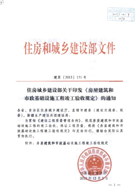轉(zhuǎn)發(fā)建質(zhì)[2013]171號《住房城鄉(xiāng)建設(shè)部關(guān)于印發(fā)<房屋建筑和市政基礎(chǔ)設(shè)施工程竣工驗收規(guī)定>的通知》