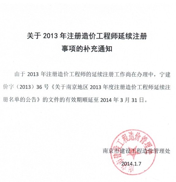 關(guān)于2013年注冊(cè)造價(jià)工程師延續(xù)注冊(cè)事項(xiàng)的補(bǔ)充通知