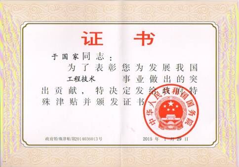國家人社部2015年1月29日發(fā)文,經(jīng)國家人社部批準(zhǔn),于國家董事長榮獲2014年享受政府特殊津貼人員榮譽(yù)。于近日頒發(fā)了榮譽(yù)證書。
