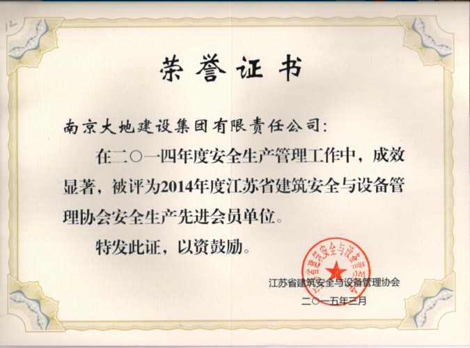 經(jīng)江蘇省建筑安全與設(shè)備管理協(xié)會(huì)第五屆理事會(huì)第十三次會(huì)議審議通過(guò),南京大地建設(shè)集團(tuán)有限責(zé)任公司被授予“2014年度江蘇省建筑安全與設(shè)備管理協(xié)會(huì)安全生產(chǎn)先進(jìn)會(huì)員單位”的稱號(hào);龐長(zhǎng)兵、江中明、胡直方三位同志被授予“2014年度江蘇省建筑安全與設(shè)備管理協(xié)會(huì)會(huì)員單位安全生產(chǎn)先進(jìn)工作者”稱號(hào)。
