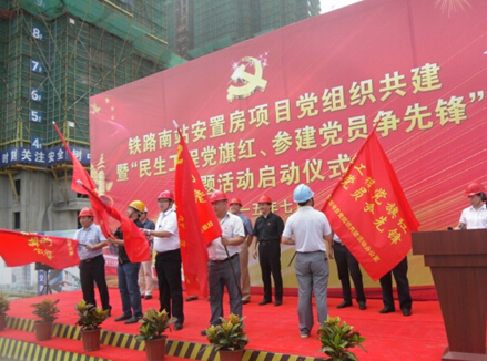 為推進(jìn)基層黨組織建設(shè),在南京交通投資置業(yè)有限公司黨總支的倡導(dǎo)下,2015年 7月1日我們偉大的黨94周年生日之際,股份公司黨委、中交四公司黨組織、黑龍江建工黨組織,在中交龍西項(xiàng)目部隆重舉行了鐵路南站安置房項(xiàng)目黨組織共建 “民生工程黨旗紅、參建黨員爭先鋒”主題活動(dòng)啟動(dòng)儀式。