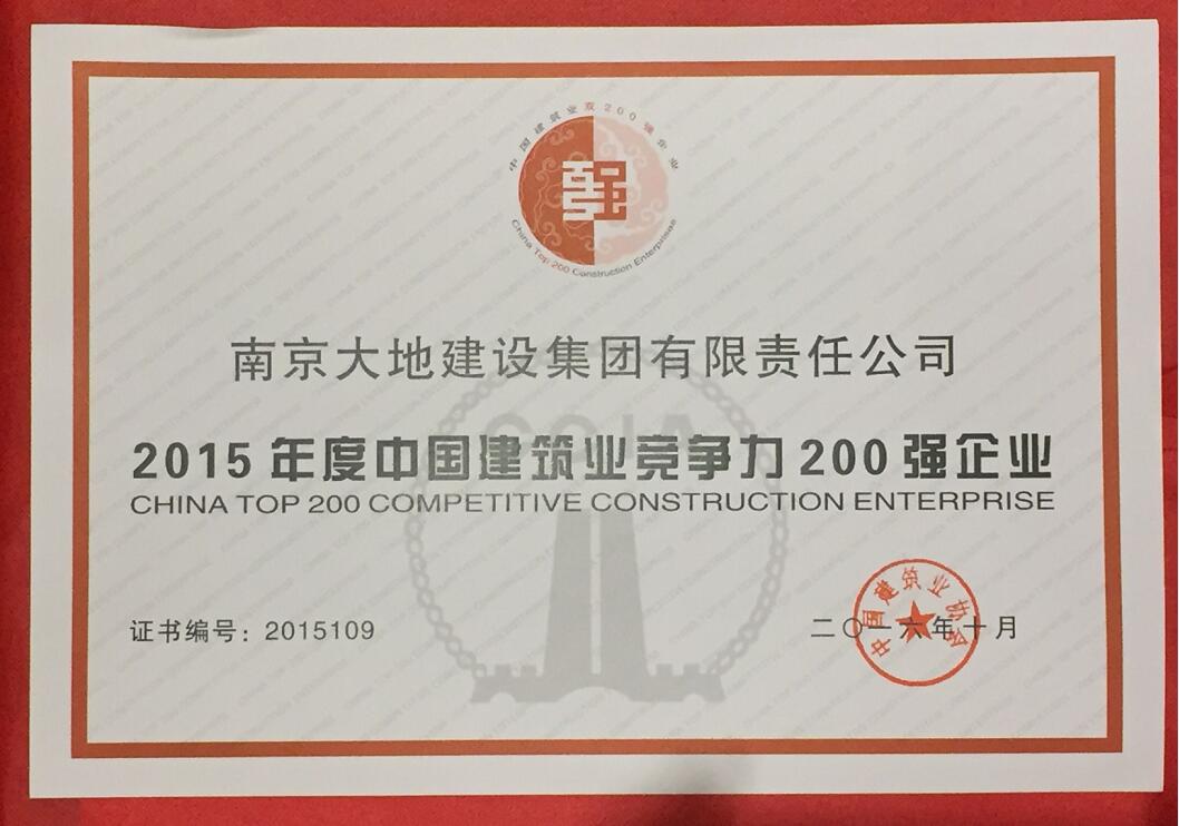 我公司榮獲2015年度中國建筑業(yè)競爭力200強企業(yè)第109名,既是大地建設(shè)在過去一年的成績單,更是社會和業(yè)內(nèi)對公司的認(rèn)可。我公司決心再接再厲,再創(chuàng)佳績。