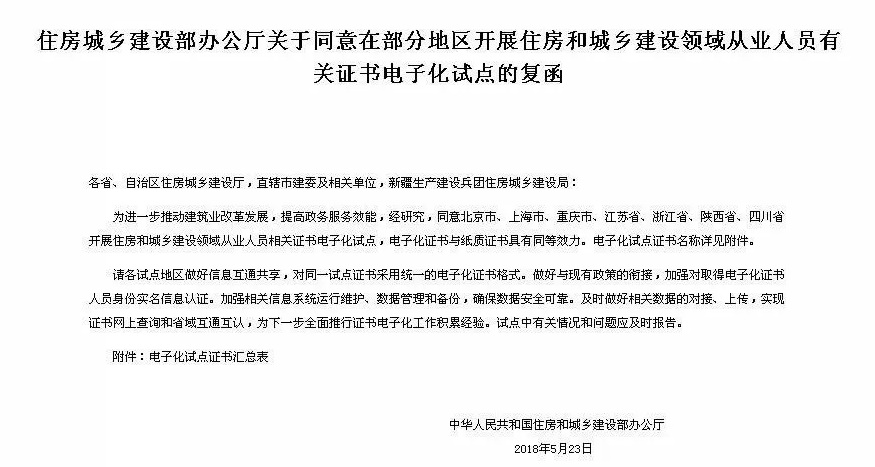 住建部要求七試點省市電子證書互通共享!江蘇在列