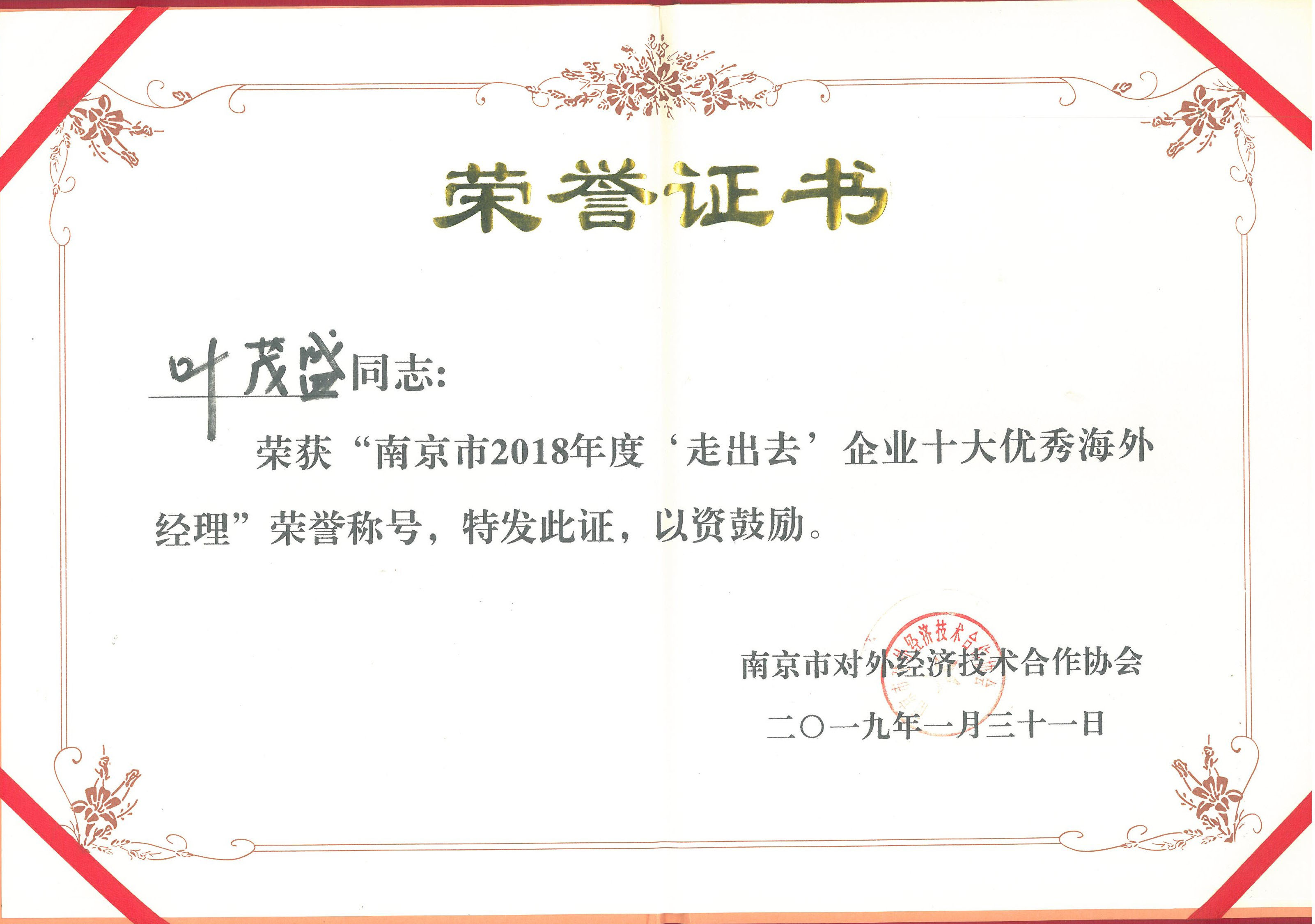 近日,南京市商務(wù)局、南京市外經(jīng)協(xié)會(huì)為獲得“南京市2018年度‘走出去’企業(yè)十大優(yōu)秀海外經(jīng)理人”的個(gè)人頒發(fā)榮譽(yù)證書(shū),南京大地建設(shè)(集團(tuán))股份有限公司新加坡分公司總經(jīng)理葉茂盛同志榮獲該榮譽(yù)稱(chēng)號(hào)。