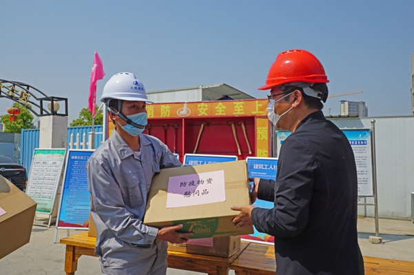 在施工現(xiàn)場,宋剛副主任一邊視察安全文明工作,一邊聽取了項目負責(zé)人桂在友就一中項目工程概況及復(fù)工復(fù)產(chǎn)情況的工作匯報,從兩個層面了解了從項目部到公司的復(fù)工復(fù)產(chǎn)安排和防疫管控措施的落實,宋剛副主任還親自將防疫物資發(fā)放到工人代表手中并要求必須要做好復(fù)工生產(chǎn)的防疫防護工作。