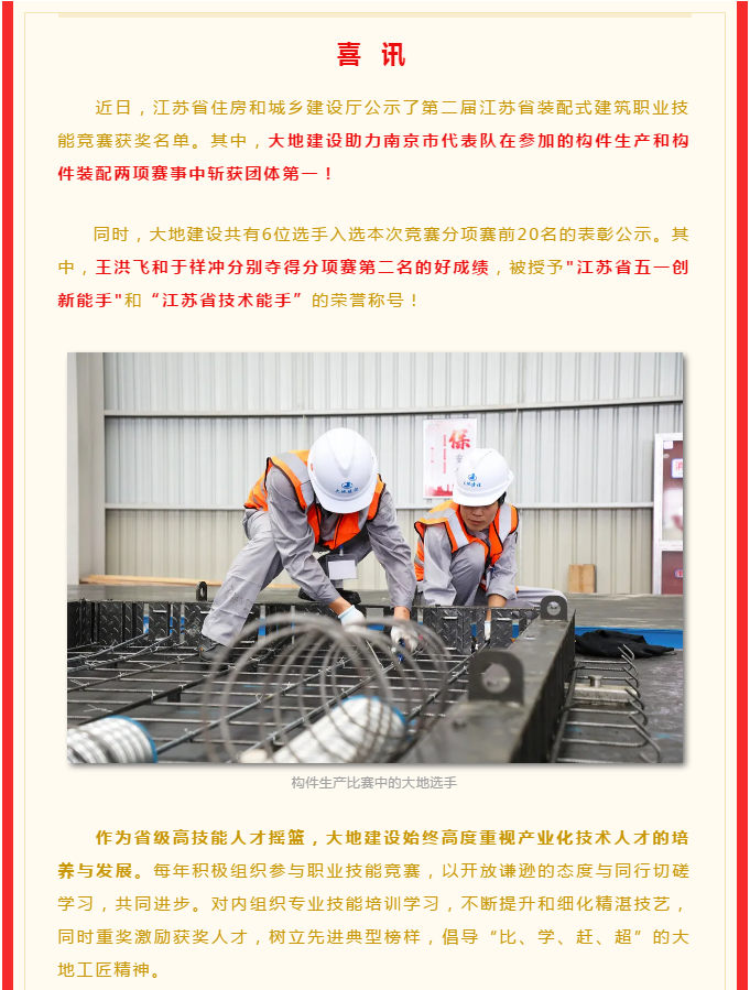 喜訊 | 大地建設(shè)助力南京市代表隊勇奪全省裝配式技能大賽兩項第一!
