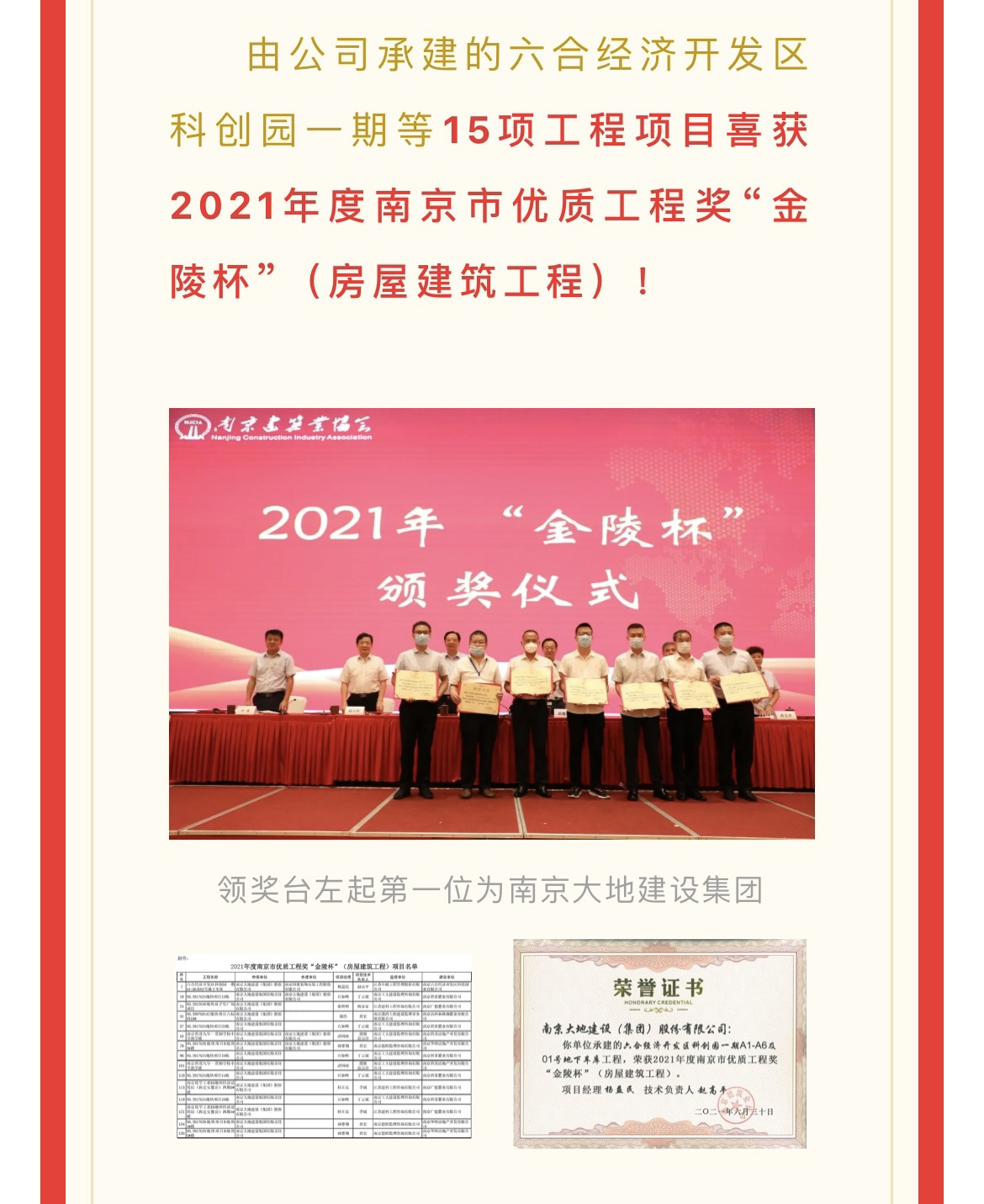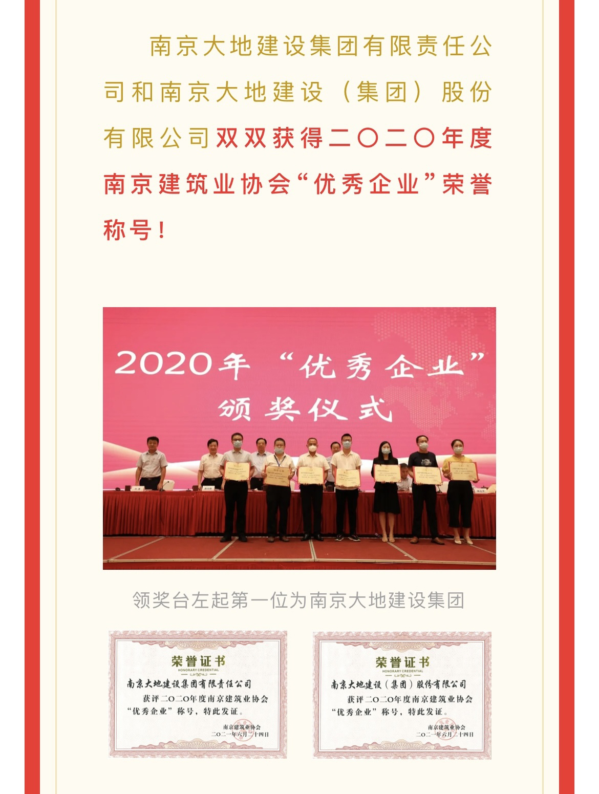 集團(tuán)獲得2020年度南京建筑業(yè)協(xié)會(huì)“優(yōu)秀企業(yè)”榮譽(yù)稱號(hào)